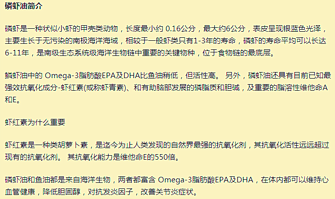 100%纯南极洲磷虾油,经过重金属测试。omega-3强化配方:omega-3脂肪酸(EPA/DHA不饱和脂肪酸),omega-3磷脂,虾青素(虾红素)。具有抗氧化、保护心血管、护理关节等作用。配方经诺贝尔生理学奖获奖者、美国著名营养学家Dr.Linus Pauling认证、推荐。服法:每日二次,每次一粒,温水吞服。