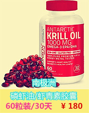 100%纯南极洲磷虾油,经过重金属测试。omega-3强化配方:omega-3脂肪酸(EPA/DHA不饱和脂肪酸),omega-3磷脂,虾青素(虾红素)。具有抗氧化、保护心血管、护理关节等作用。配方经诺贝尔生理学奖获奖者、美国著名营养学家Dr.Linus Pauling认证、推荐。服法:每日二次,每次一粒,温水吞服。