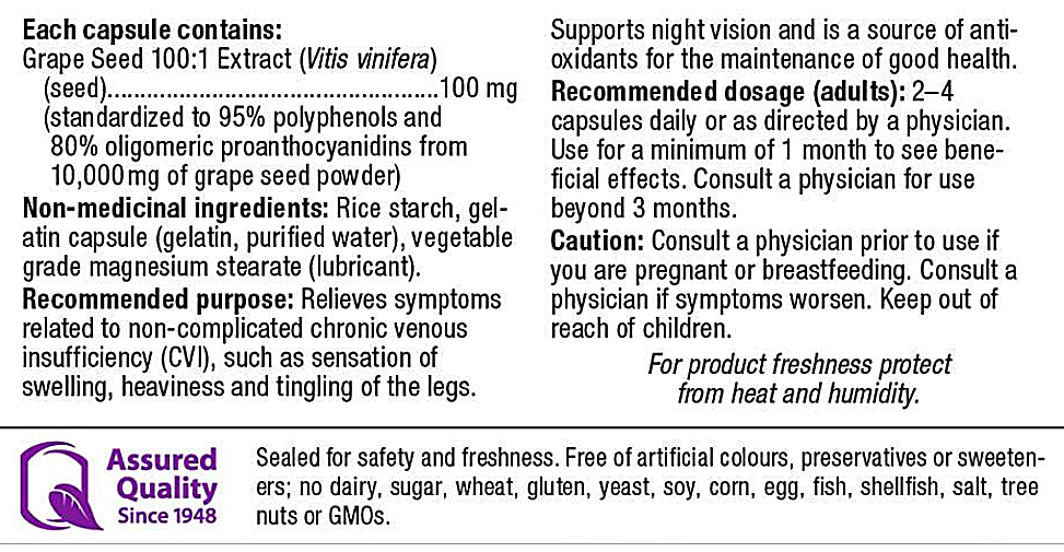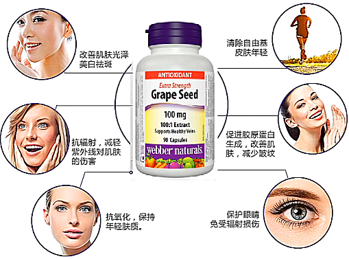 优质、非转基因葡萄籽提取物制成的胶囊,每粒胶囊含100mg葡萄籽浓缩提取物。其中:葡萄籽多酚含量达95%,原花青素(黄酮)含量达80%。