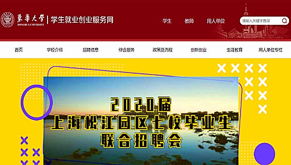 松江大学园区七校联合招聘会(东华/上外/华东政法/上海外贸/上海工程技术/上海立信会计/上海视觉艺术),上海西南五校联合招聘会(交大/华师大/华东理工/东华/华东政法)。