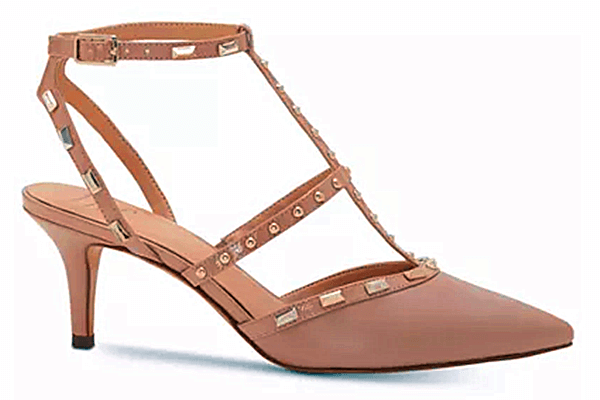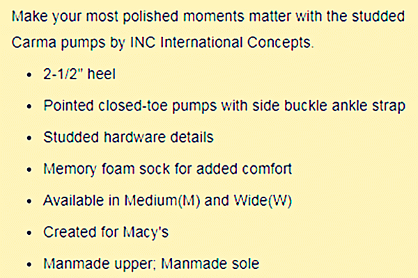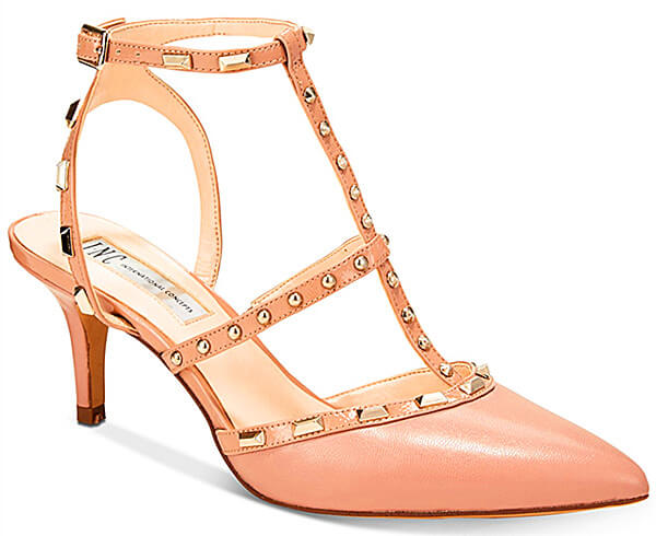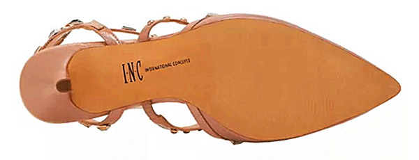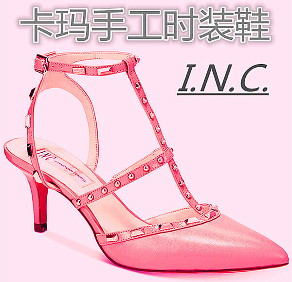 2.5寸包根,合趾封闭式尖头,侧扣,踝带,镶钉装饰,海绵内衬,精工合成鞋面与鞋底。美国I.N.C.国际女鞋品牌。