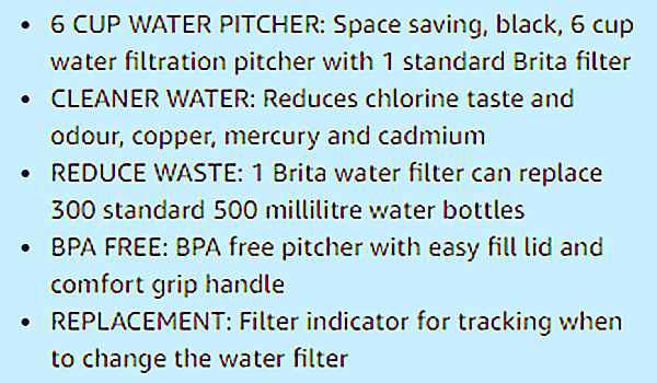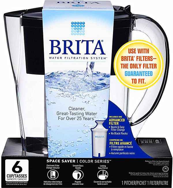 BRITA-6杯水容量净水壶,附带1只Brita标准虑水芯。通过活性炭、离子交换树脂,净化自来水水质,滤化氯、汞、铜、镉等有害矿物质与异味杂质。1只brita标准虑水芯,可净化300瓶500毫升的水。壶盖上的指示器,可追踪与转换功能。BPA-FREE材料。
