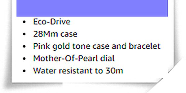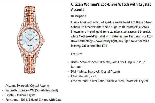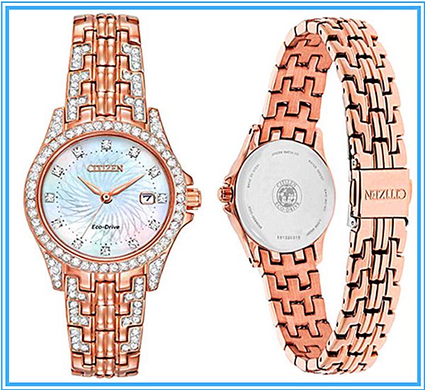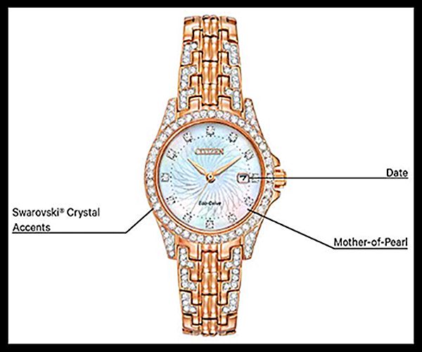 光驱动,日历,珍珠母表底,表内刻度、表盘及周围镶有施华洛世奇水晶宝石,玫瑰金表壳与表链,折叠按钮式表扣,30米防水。