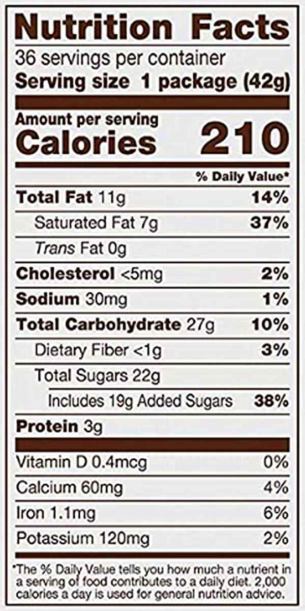 脂肪总量11g,饱和脂肪7g,反式脂肪0,胆固醇<5mg,钠30mg,碳水化合物27g,膳食纤维<1g,糖22g,蛋白质3g,VD-0.4mcg,钙60mg,铁1.1mg,钾120mg。
