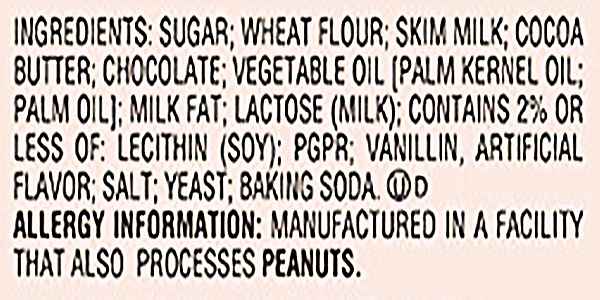 糖,麦粉,脱脂牛奶,可可油脂,巧克力,植物油,乳脂,乳糖,大豆卵磷脂,乳化剂,香兰素,香精,盐,酵母,小苏打。