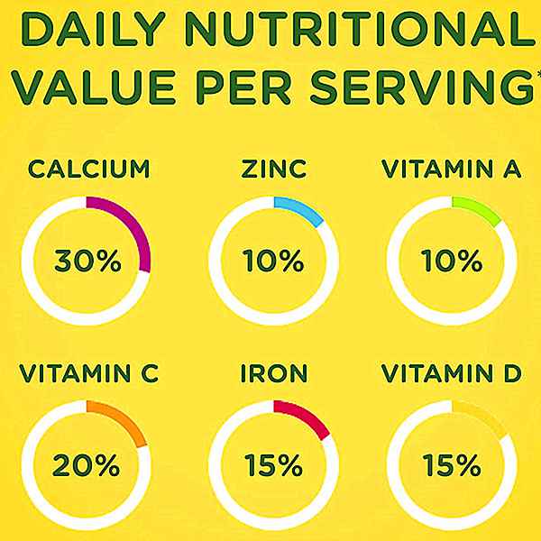 钙30%,锌10%,维生素A-10%,维生素C-20%,铁15%,维生素D-15%。